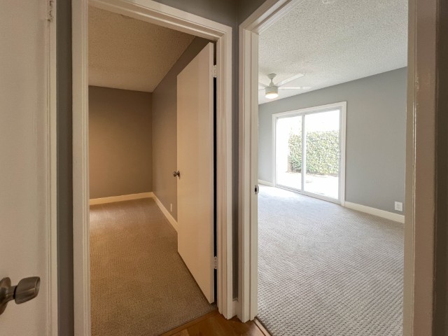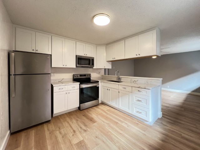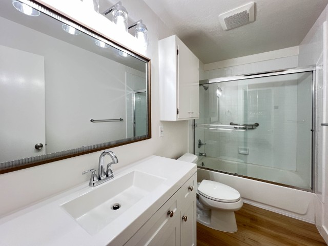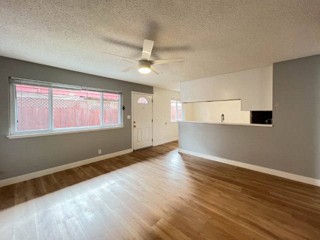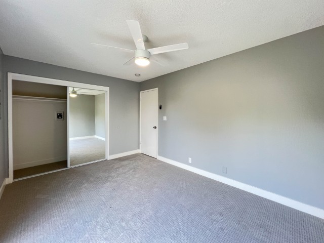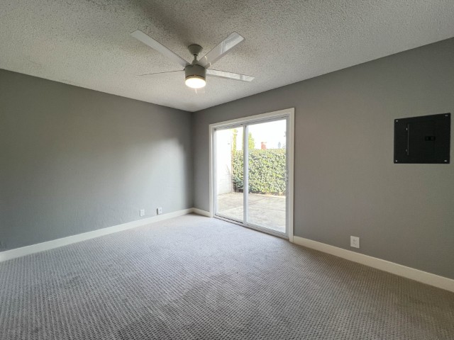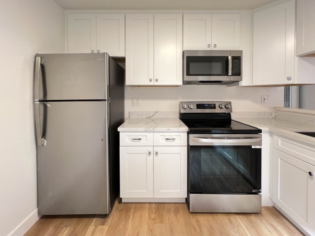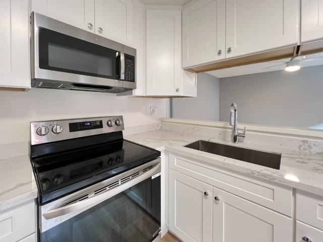 Welcome to this freshly painted, bottom-floor end unit offering modern upgrades, a large private patio, and convenient location! Apartment Highlights: Fully Remodeled Kitchen: Carrera-style quartz countertops Shaker-style soft-close cabinets & drawers Stainless steel appliances including: Overhead built-in microwave Refrigerator Glass cooktop range/oven with no-preheat AirFry Deep stainless steel sink with pull-down faucet/sprayer Flooring & Paint: Newer laminate flooring in common rooms and hall, brand new carpet in bedrooms Freshly painted for a clean, modern feel Bedrooms: Primary bedroom with dual closets and new mirrored doors Second bedroom with large wall-to-wall closet & sliding door to large private patio Bathroom: New vanity with ample counter space & drawers Updated shower-over-tub with glass doors (installed ~2 years ago) Additional Features: Dual-pane windows LED lighting & ceiling fans in all major rooms Community & Location Perks: 1 covered carport parking space with storage locker On-site laundry Conveniently located near shopping, dining, and Burlingame Ave